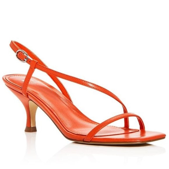 Svelte straps create an elegant asymmetrical profile on a barely there sandal lofted by a kitten heel.